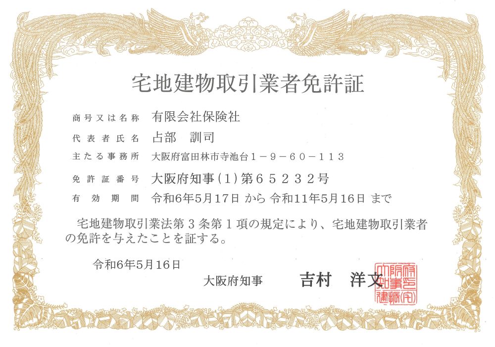 この度、有限会社保険社は宅地建物取引業者の免許を取得いたしました。